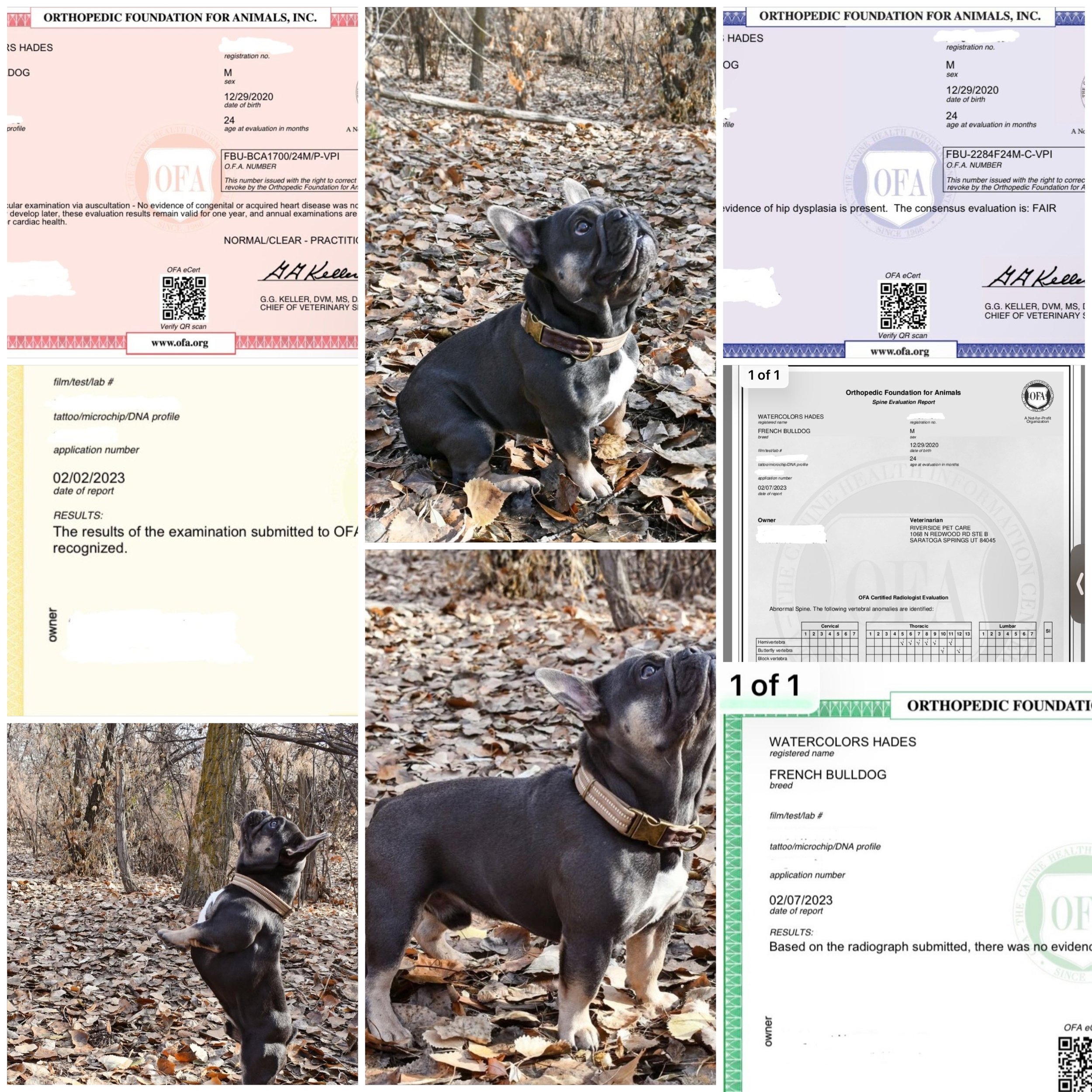 Owner: Watercolor French BulldogsIntroducing Hades! He is a very handsome blue and tan boy. He is 27-pounds of solid muscle, with loads of wrinkles on top. He has wonderful structure and is very compact with tight feet, and a large headpiece. Hades sports awesome natural roping above his nose, and has the most open natural nares I have seen on a Frenchie. He has zero breathing issues and can play all day! Hades has sired multiple litters who have inherited his many wonderful traits. Similar to Miss Harley, Hades also has an amazing temperament and demeanor. He gets along famously with everyone he meets! In addition to his structure, beauty and temperament, Hades is also a very healthy guy (see health testing details above).